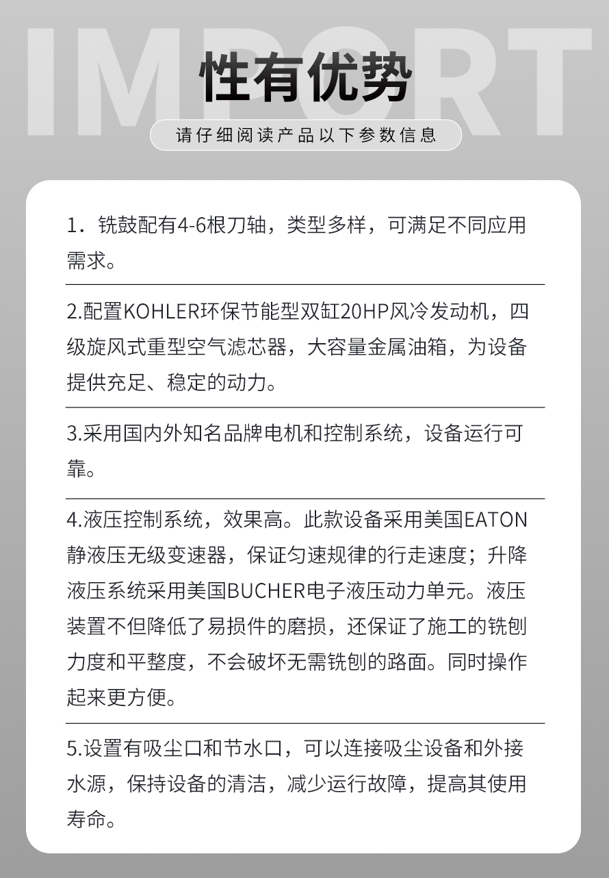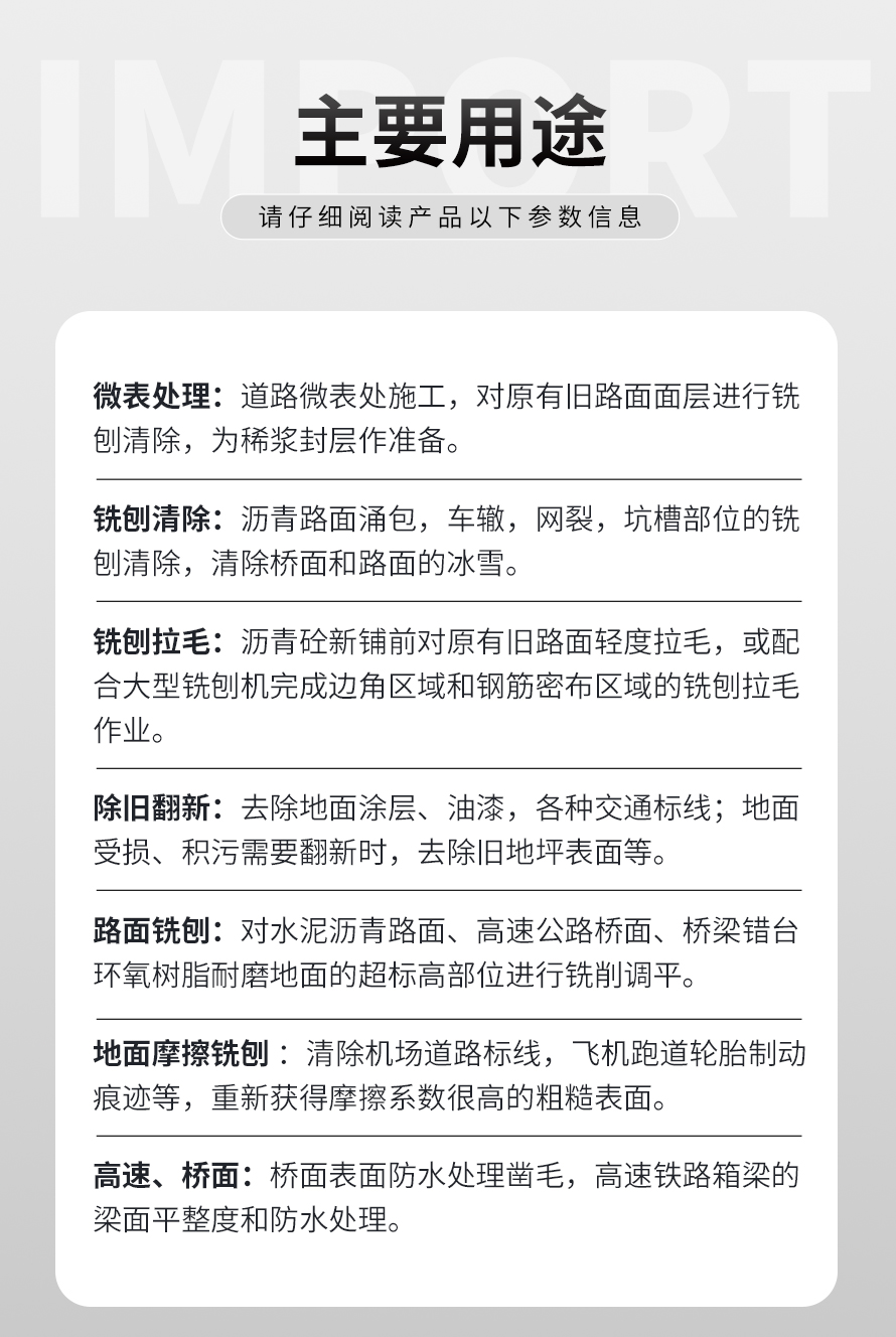 液壓銑刨機(jī)結(jié)構(gòu)緊湊,布局合理,具有控制精度高、性能穩(wěn)定、操作簡(jiǎn)單、維護(hù)保養(yǎng)方便等優(yōu)勢(shì)。其適合各種強(qiáng)度較高的混凝土瀝青等高出部分的去除工作,是其它類(lèi)型的銑刨機(jī)無(wú)法替代的產(chǎn)品。